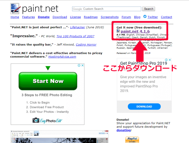Paint.netのダウンロードのリンクは、ちょっとわかりづらい場所にあります。こちらをご覧ください。