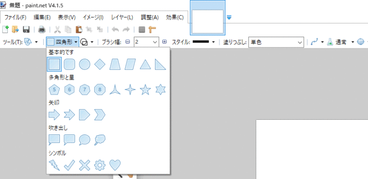 Paint.netでは、四角や丸などの基本的な図形から、矢印や吹き出しなどの複雑な図形、そして稲妻やバツマーク、ハートなどのちょっとしたシンボルの描画までサポートしています。