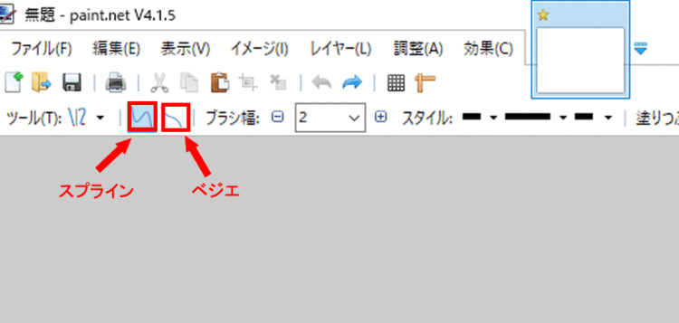 直線・曲線では、「スプライン」と「ベジエ」の2種類の描画ツールが選択できます。この2つの違いは、例えば曲線を書くときの線の制御の仕方です。曲線の角度を変えたりするときに、その制御ポイントが違います。