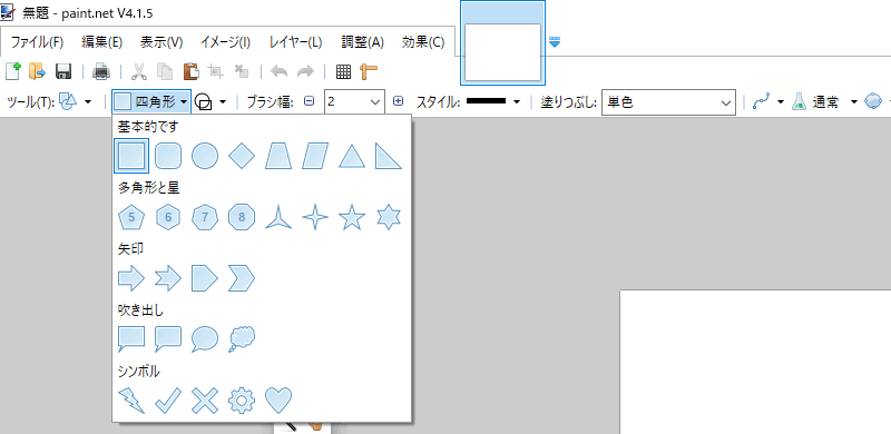 Paint.netでは、四角や丸などの基本的な図形から、矢印や吹き出しなどの複雑な図形、そして稲妻やバツマーク、ハートなどのちょっとしたシンボルの描画までサポートしています。