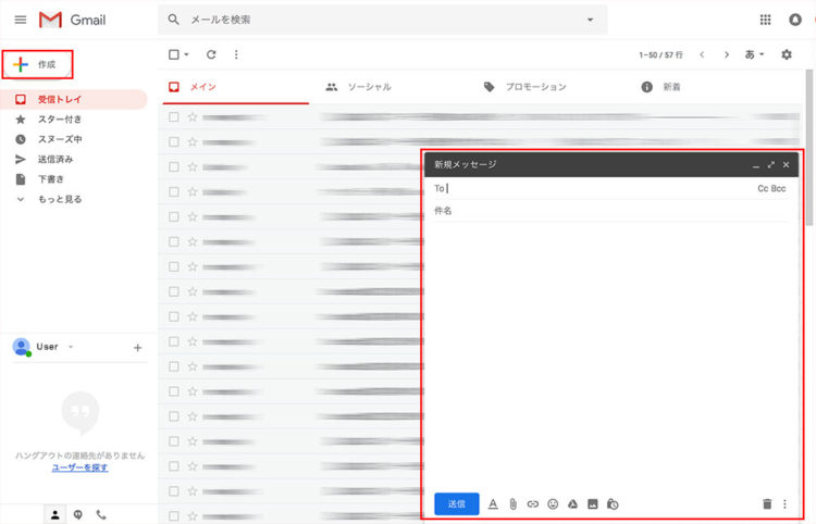 画面左上の表示されている「+作成」ボタンをクリックすると、「新規メッセージ」画面(新規メールを作成する画面)が、ポップアップ表示されます。