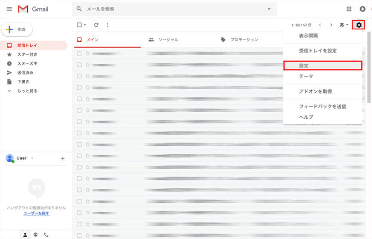 自動転送を設定した時と同じように、画面右上の歯車アイコンから「設定」を選択します。