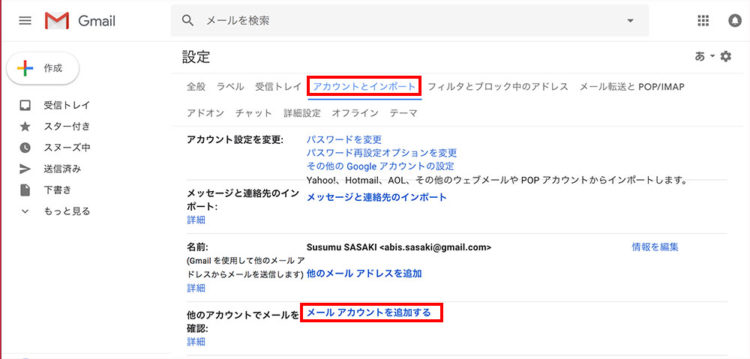「アカウントとインポート」タブの「他のアカウントでメールを確認」から「メールアカウントを追加する」をクリックします。