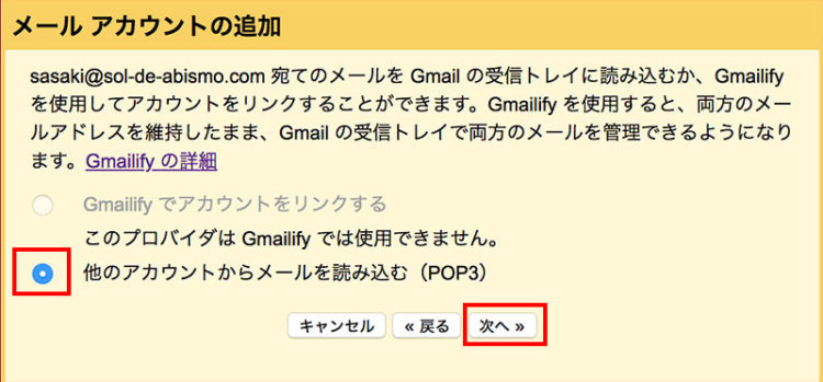 「他のアカウントからメールを読み込む(POP3)」にチェックをいれて「次へ」ボタンをクリックします。