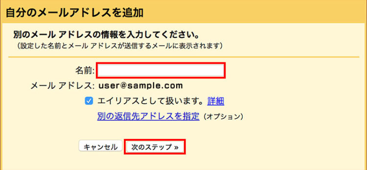 「名前」を入力します。入力した名前は送信した相手の受信トレイに送信者として表示されます。「次のステップ」ボタンをクリックします。