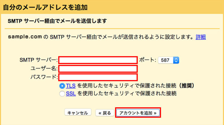 SMTPサーバー、ポートなどはご利用のレンタルサーバーで確認してください。「アカウントを追加」ボタンをクリックします。