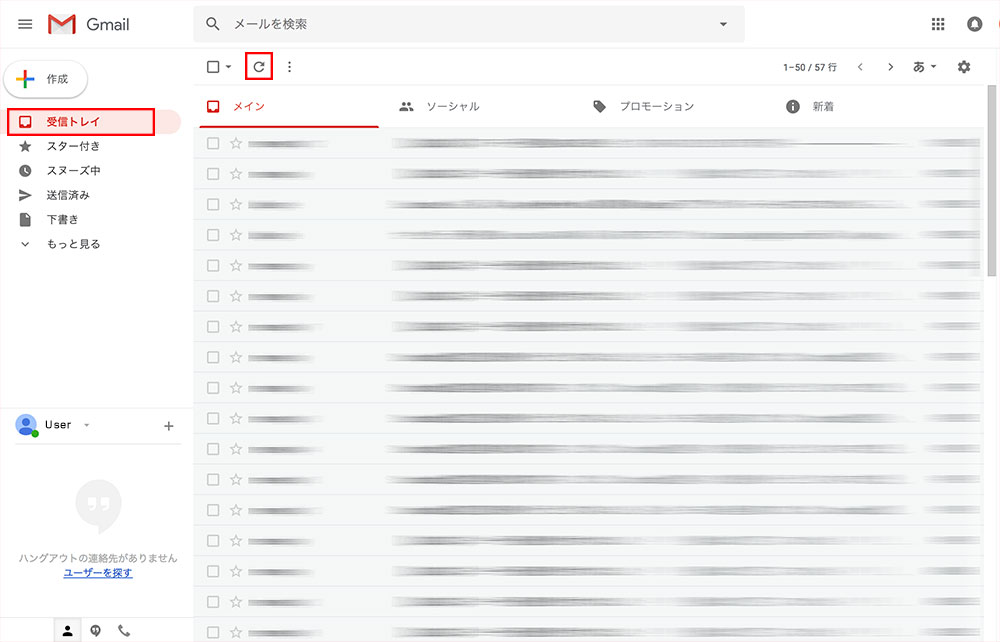 メールは自動で受信されていますが、矢印のアイコン(くるっと回ったような形の矢印)をクリックすると、情報を更新し、最新のメールを受信することができます。