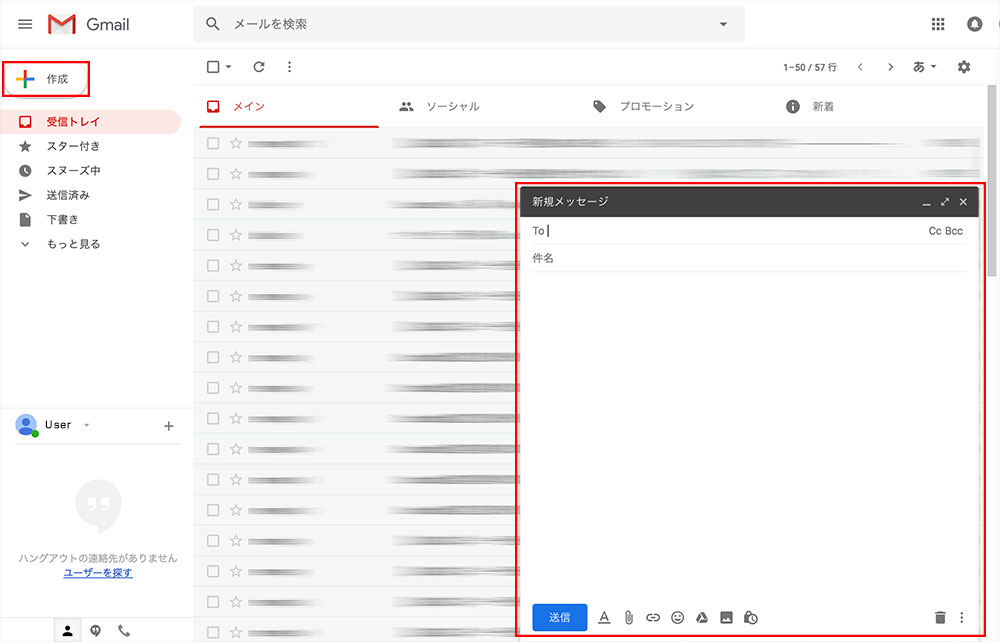 画面左上の表示されている「+作成」ボタンをクリックすると、「新規メッセージ」画面(新規メールを作成する画面)が、ポップアップ表示されます。