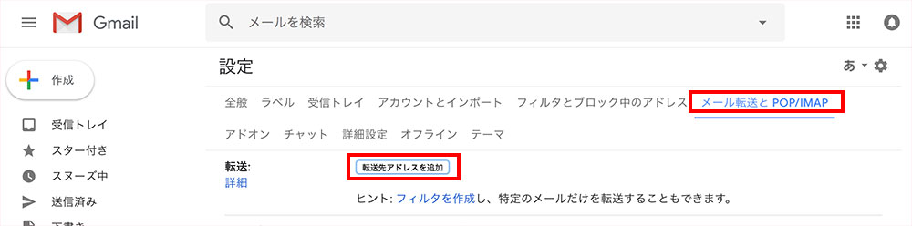 「転送先アドレスを追加」ボタンをクリックして、メールアドレスを入力します。