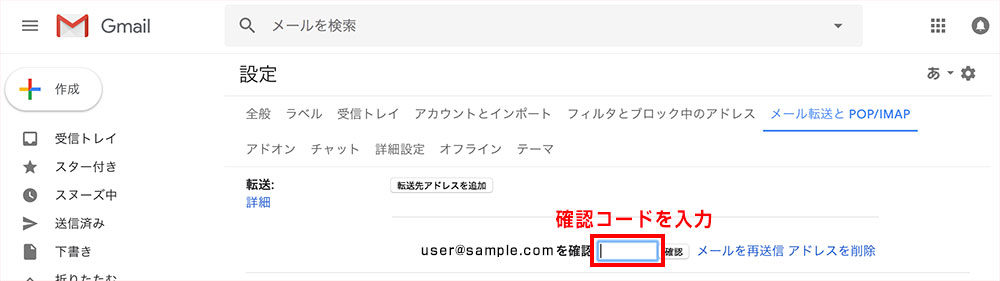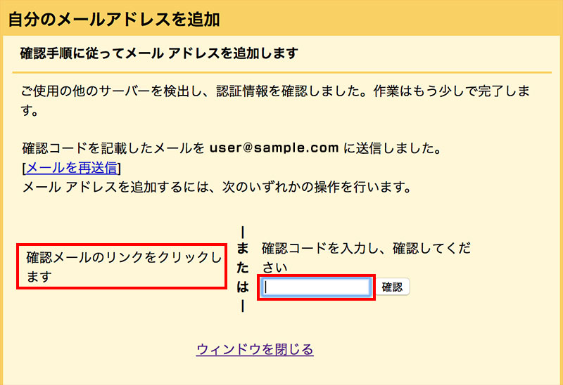 転送先に指定したアドレス宛に確認のメールが送信されますので、そのメールに書いてある承認用のリンクをクリックするか、確認コードを入力すると、アドレスが登録されます。
