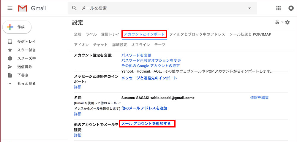 「アカウントとインポート」タブの「他のアカウントでメールを確認」から「メールアカウントを追加する」をクリックします。