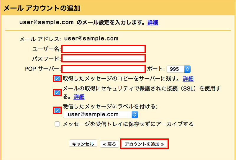 ユーザー名、パスワード、POPサーバーを入力します。分からない場合はご利用のレンタルサーバーで確認してください。