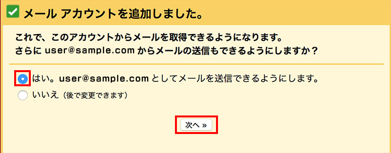 ドメインメールで送信できるようにするために、「はい。」にチェックを入れて「次へ」ボタンをクリックします。
