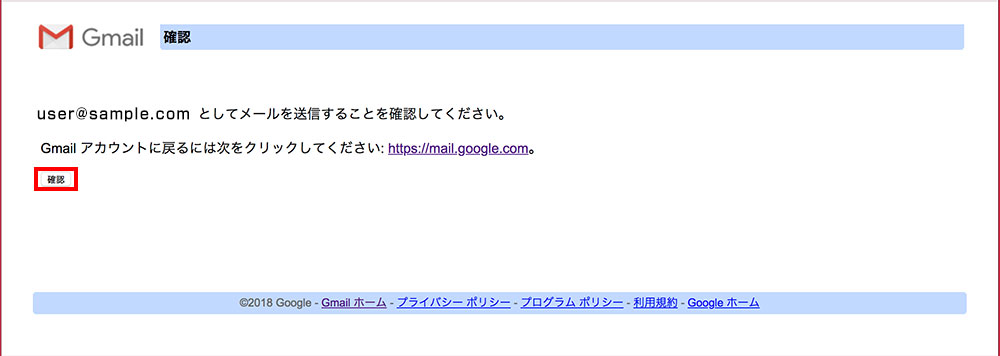 メール記載のリンクから画面遷移できれば、表示されるページで「確認」ボタンをクリックします。