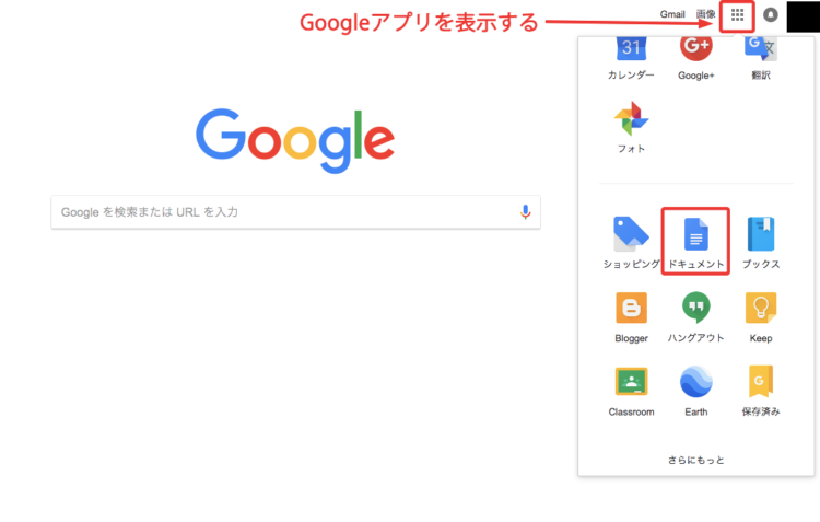 すると、様々なGoogleアプリが表示されるので、「ドキュメント」と書いてあるものを探してクリックします。