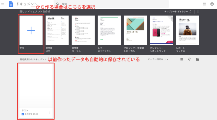Googleドキュメントのトップページに移動するので、新規作成する場合は「新しいドキュメントを作成」の中から選びます。また、以前作成したファイルを編集する場合は、その下の「最近使用したドキュメント」から編集することが可能です。