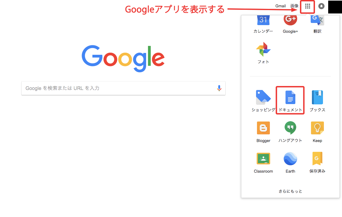 Google検索のトップページから、右上の方に四角形がたくさん並んでいるアイコンを選択します。