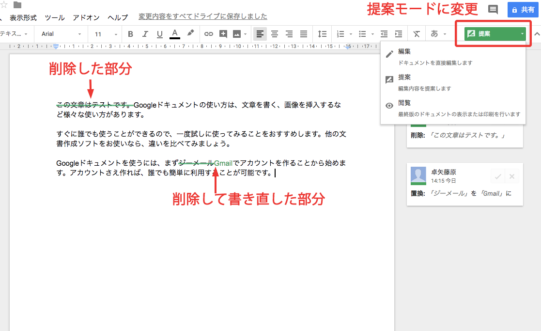 さらに、誤字・脱字を自動的に検出したり、他の人が編集したことがわかる「提案モード」などもあり、テキスト原稿としても優秀です。