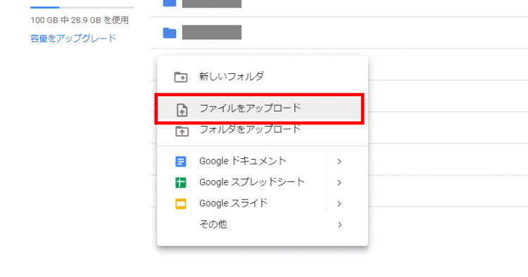 マイドライブにアクセスできたら、「新規」ボタンから「ファイルをアップロード」を選択します。