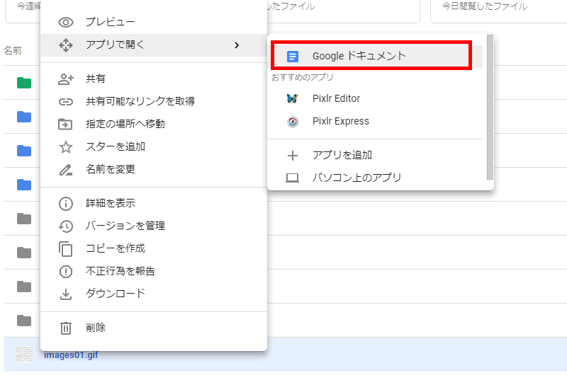 - アップロードした画像ファイルを右クリックして、「アプリで開く」→「Googleドキュメント」を選択