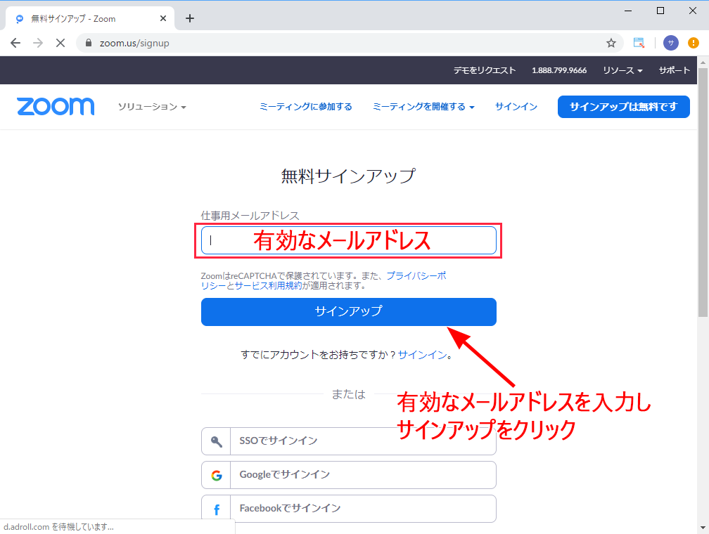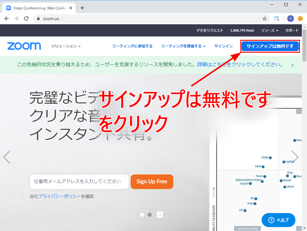 https://zoom.us/ へアクセスし、Topページの右上にある「サインアップは無料です」というボタンをクリックします。
