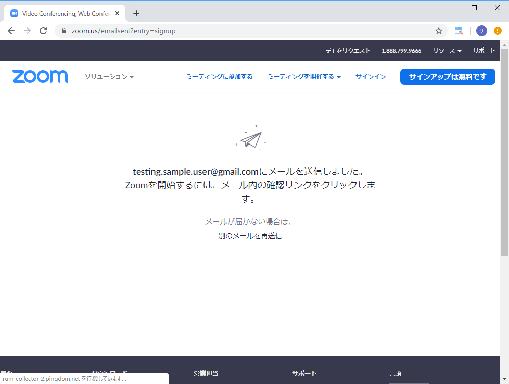 入力したアドレス宛にメールが配信されています。稀に送信がされない場合があり、この画面で再送信を要求できるので、一応開いたままにしておいてください。