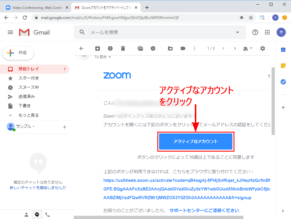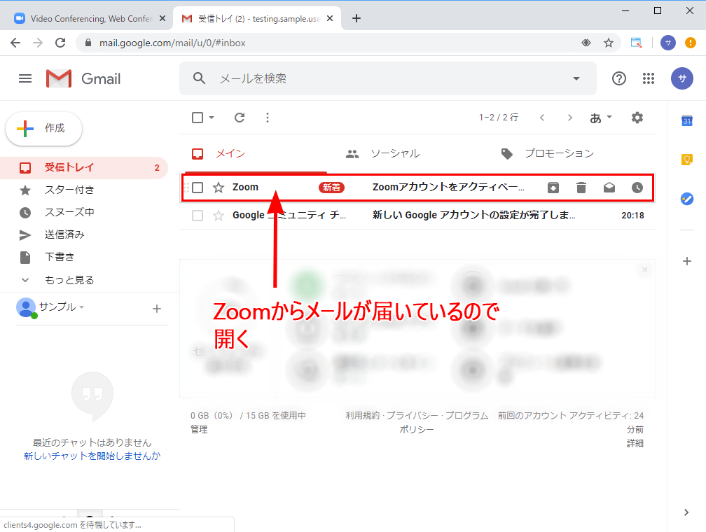 お使いのメールアプリケーションで受信トレイを開くと、Zoomからメールが届いているので開いてください(ここではGmailの画像を使っています)。