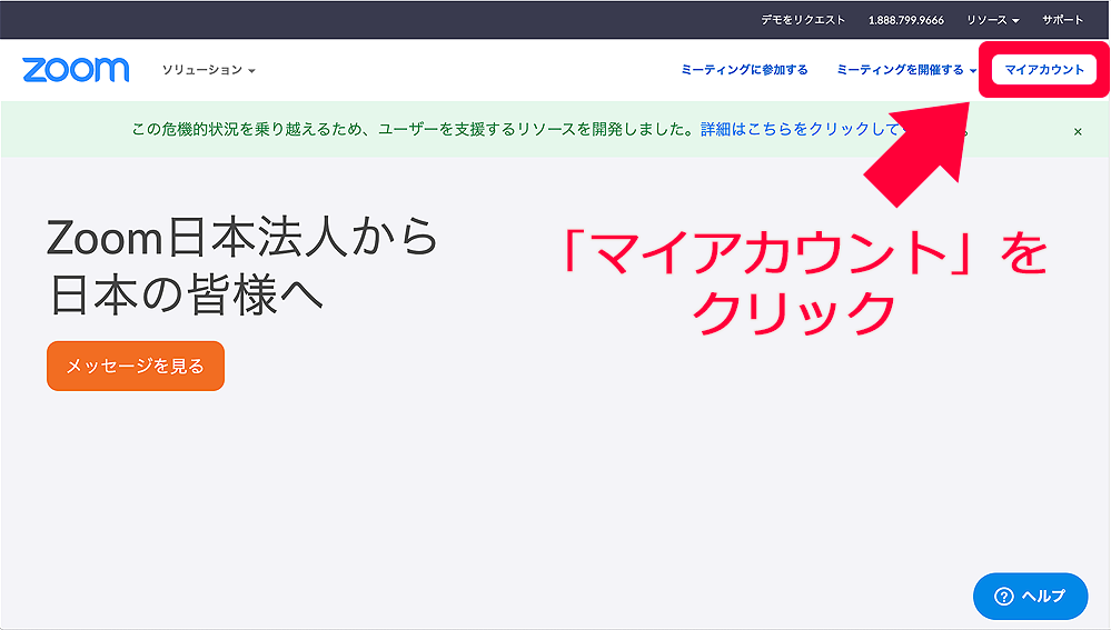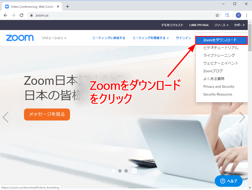 https://zoom.us/ へアクセスし、Topページの右上にある「リソース」というメニューにマウスカーソルを置くとメニューが表示されます。