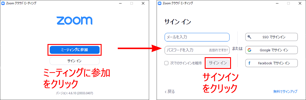 ミーティングへ参加する方法だけを見たい方は、「ミーティングへ参加する」までジャンプしてください。