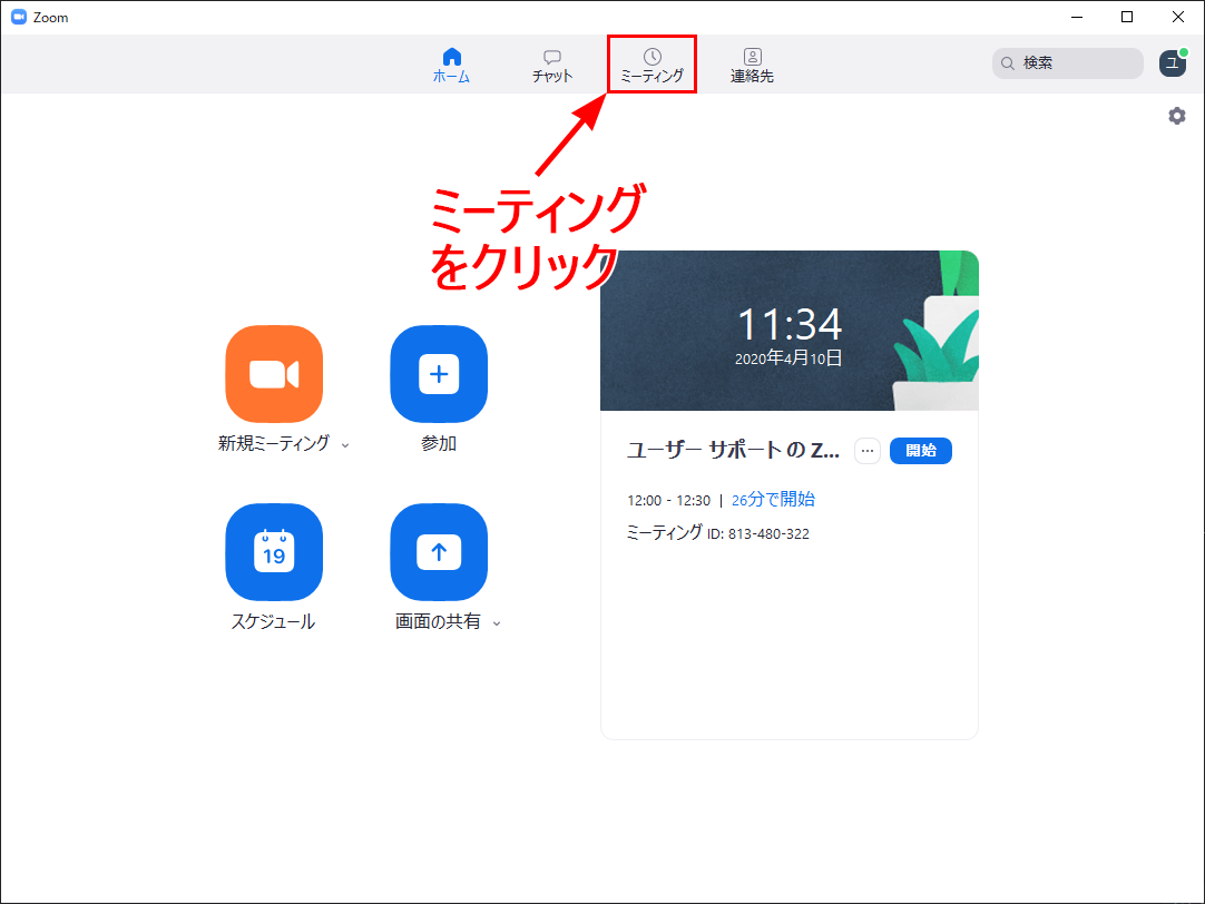 サインインをすると、ホーム画面が表示されるので、上部のタブから「ミーティング」を選びクリックしてください。