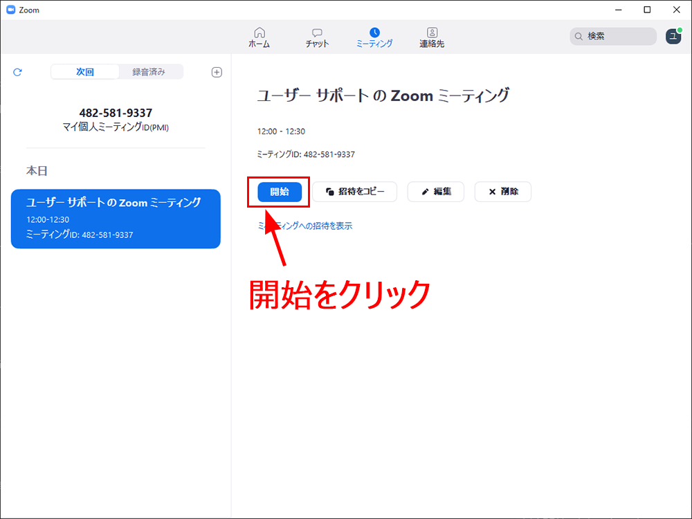 「開始」ボタンをクリックすると、即座にミーティングが開催されます。