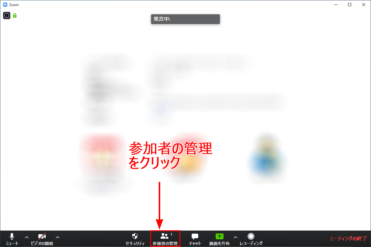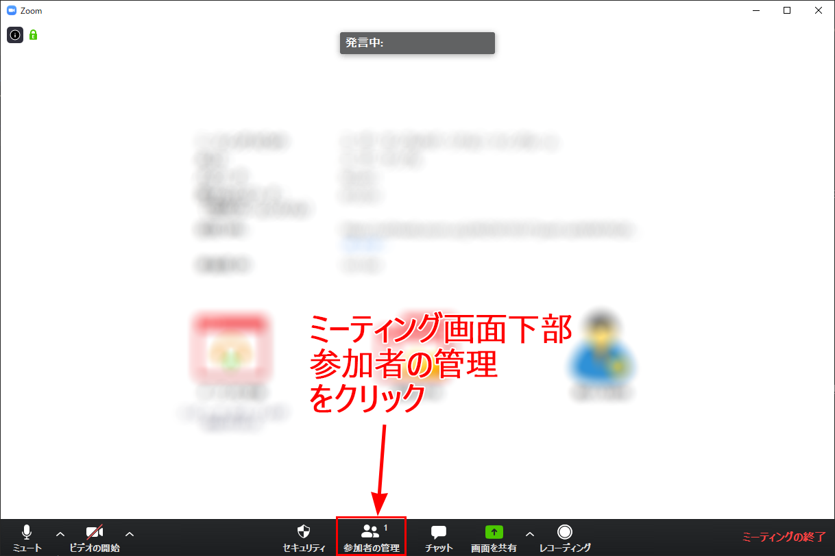 ミーティングを管理するには、画面下部にある「参加者の管理」をクリックしてください。