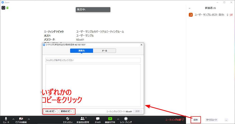 ミーティング画面から招待URLをコピーする