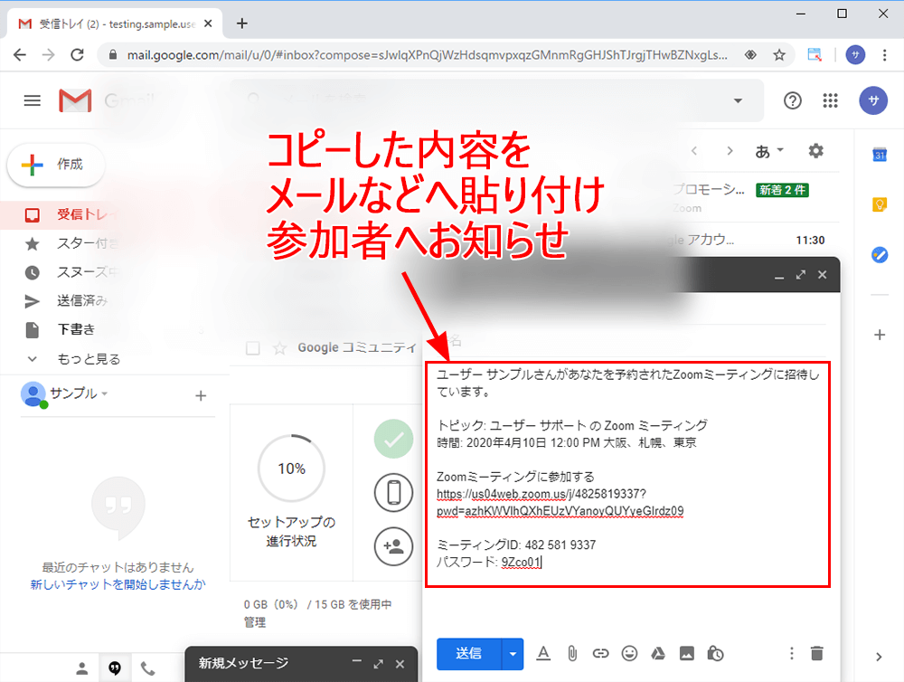以下は、Gmailで招待をしているサンプルですが、メッセージを送れるツールであればなんでもOKです。