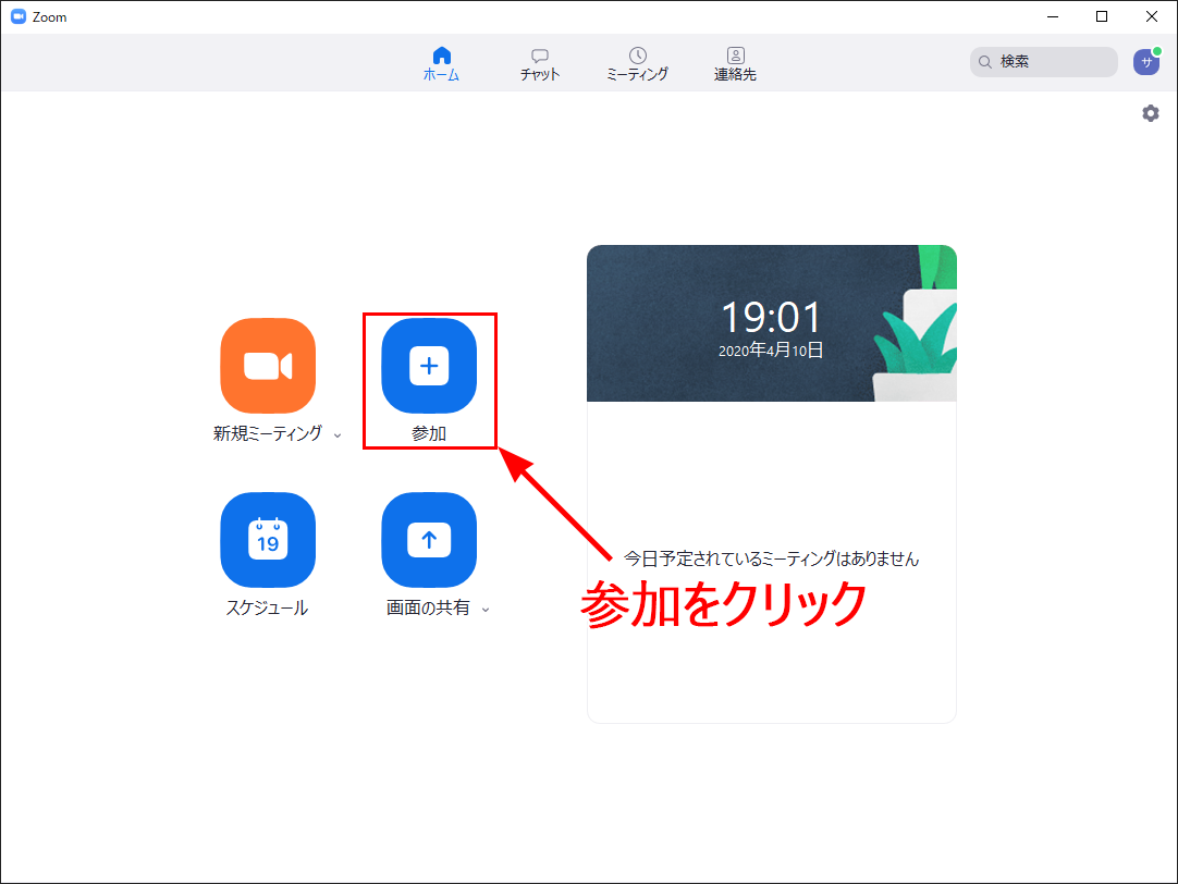 Zoomのホーム画面にある「参加」をクリックしてください。