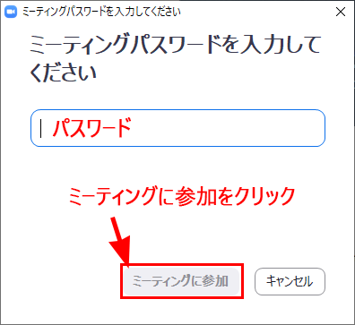 主催者から伝えられたパスワードを入力して、「ミーティングに参加」をクリックしてください。