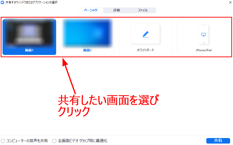 共有したい画面を選び、「共有」ボタンをクリックすると、その画面をミーティング参加者が全員見ることができるようになります。