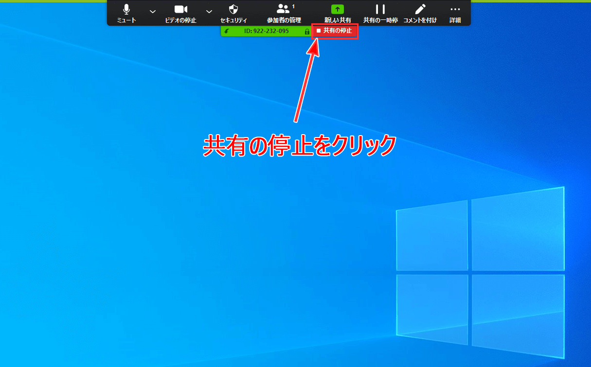 画面の共有を停止するには、画面上部に表示されているメニューにある「共有の停止」をクリックします。