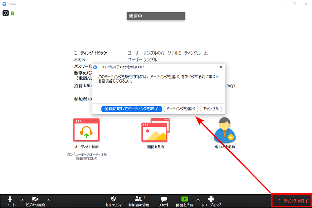 「ミーティングを退出」をクリックすると、ミーティング自体は続き自分だけがミーティングから退出することができます。