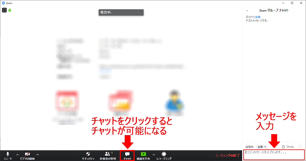 ミーティング下部の「チャット」をクリックすると、チャット画面が開きます。