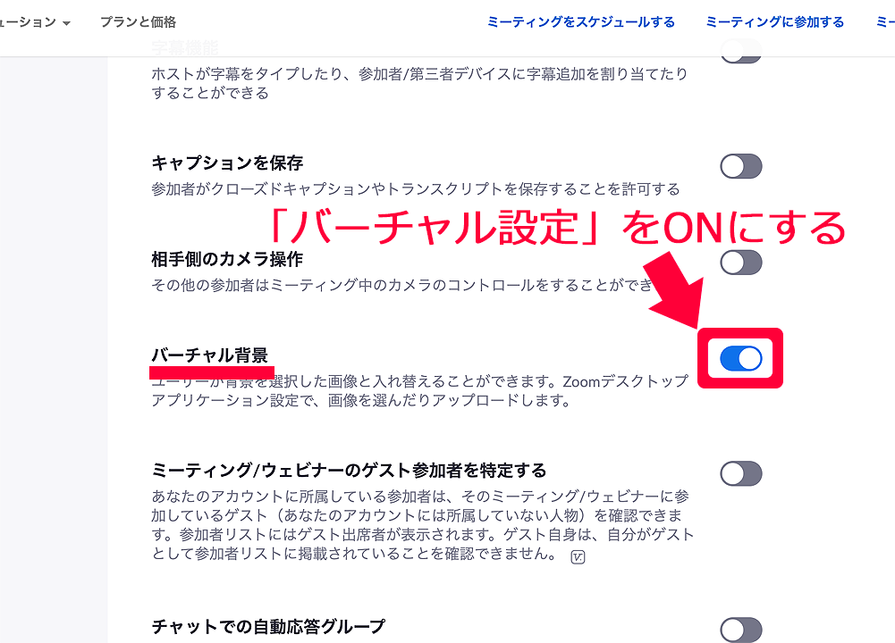 右側コンテンツの「ミーティング」の中の「バーチャル背景」をONの状態にします。