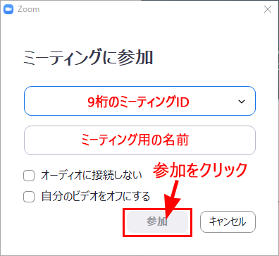 ダイアログが表示されるので、主催者から伝えてもらった9桁のミーティングIDと自分の名前を入力し、「参加」をクリックしてください。