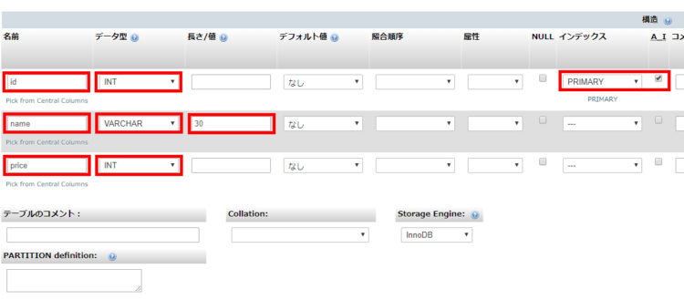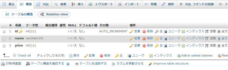 さきほど作成した「items」テーブルを設計しましょう。先ほど説明したように、「items」テーブルには「ID(id)」「名前(name)」「価格(price)」の3つのカラムを設定します。