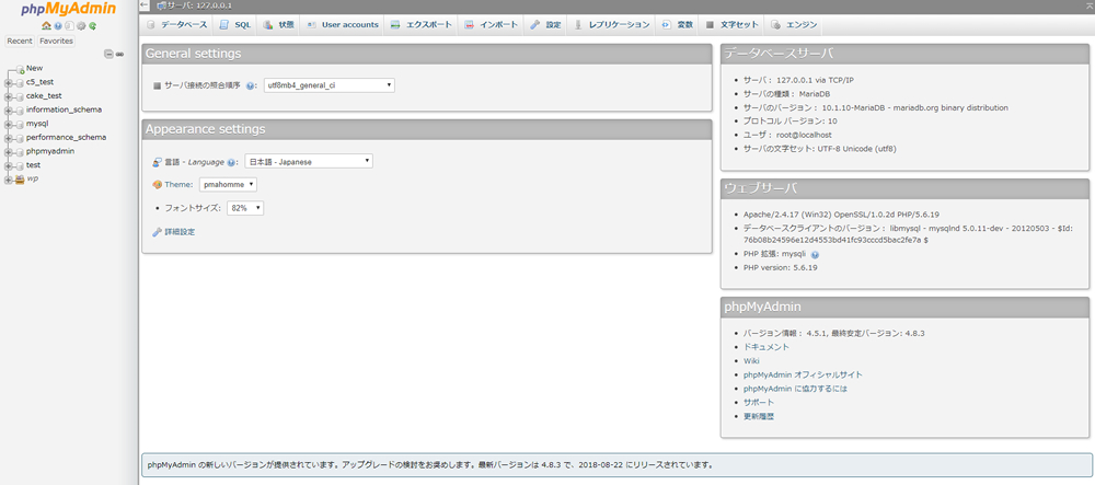 phpMyAdminの管理画面のトップページは、以下のようになっています。