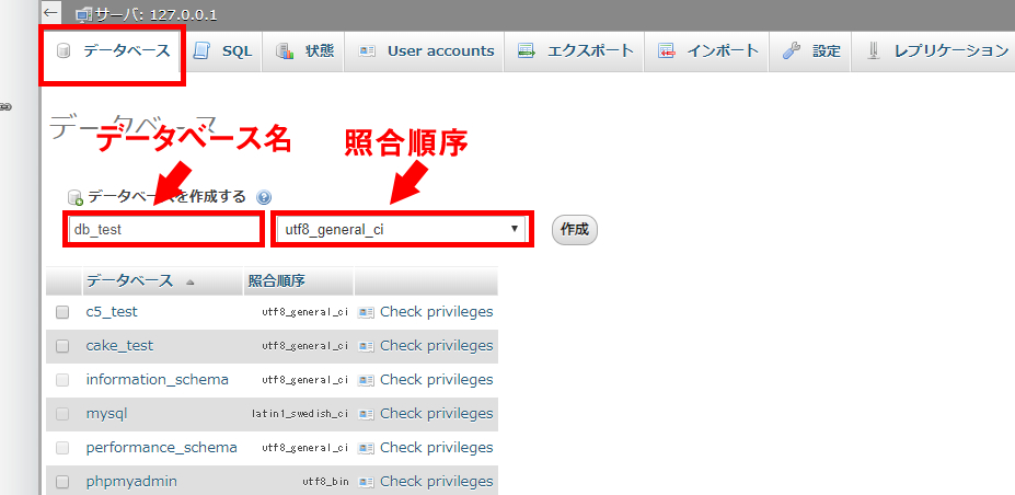 ここでは、データベース名に「db_test」照合順序に「utf8_general_ci」を選択します。照合順序というのは文字コードと文字列の扱い方の種類というくらいに考えてください。