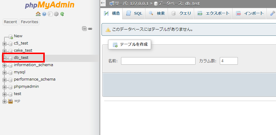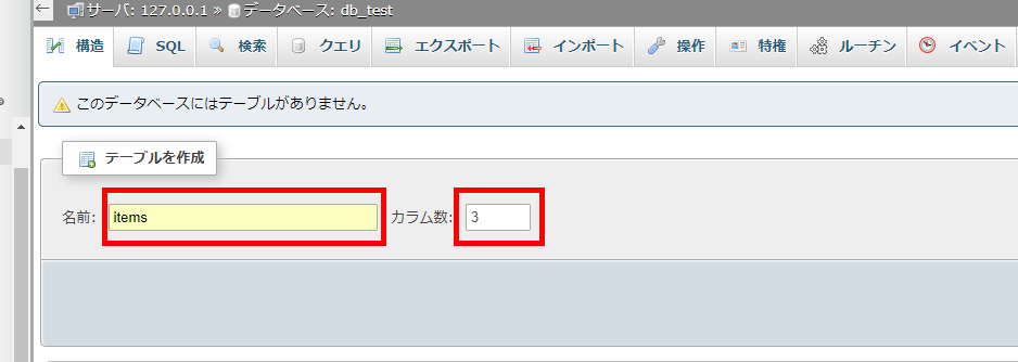 続いて「db_test」に新しいテーブルを追加しましょう。データベースを新規作成すると「テーブル作成」の画面が表示されます。