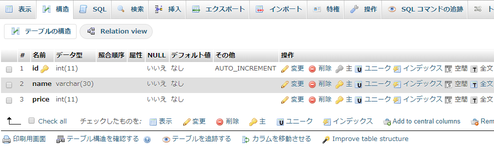 さきほど作成した「items」テーブルを設計しましょう。先ほど説明したように、「items」テーブルには「ID(id)」「名前(name)」「価格(price)」の3つのカラムを設定します。