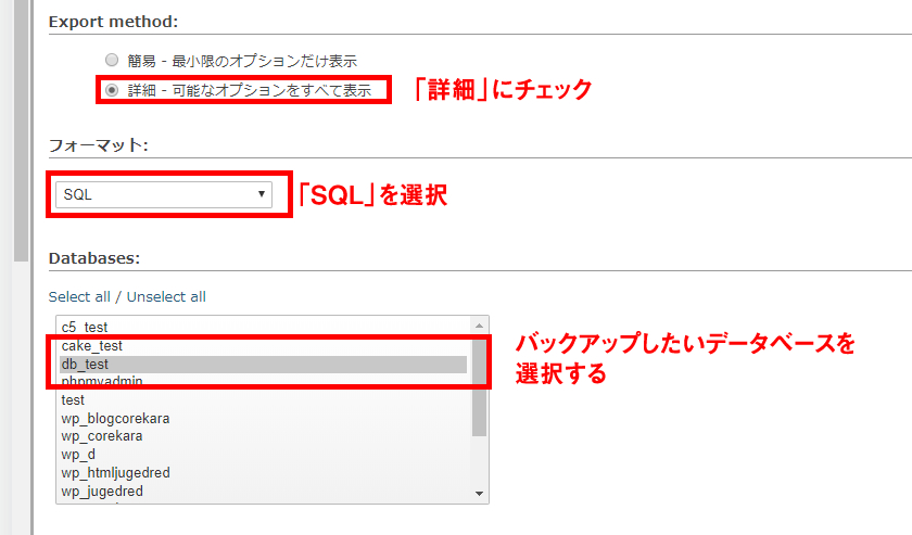 フォーマットには「SQL」を選択し、「Databases」にはバックアップしたいデータベースを選択します。ここでは複数のデータベースをまとめて選択することも可能です。