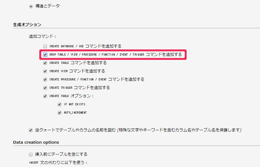 生成オプションの「DROP TABLE / VIEW / PROCEDURE / FUNCTION / EVENT / TRIGGER コマンドを追加する」にチェックを入れます。データベースの復元するとき、同じ名前のテーブルは2つ作れないので、同名のテーブルが存在すれば、DROP コマンドでこれを削除します。