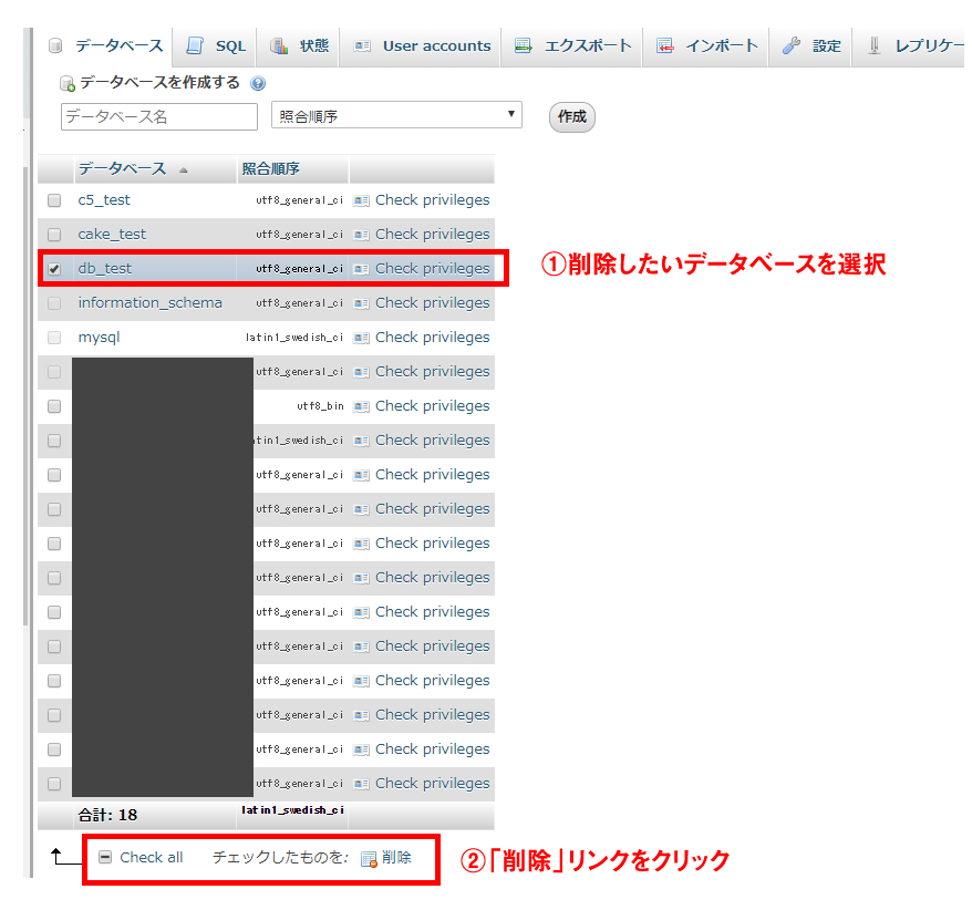 データベースの削除もphpMyAdminで行えます。「データベース」タブをクリックし、データベース一覧から削除したいデータベースのチェックボックスを選択します。